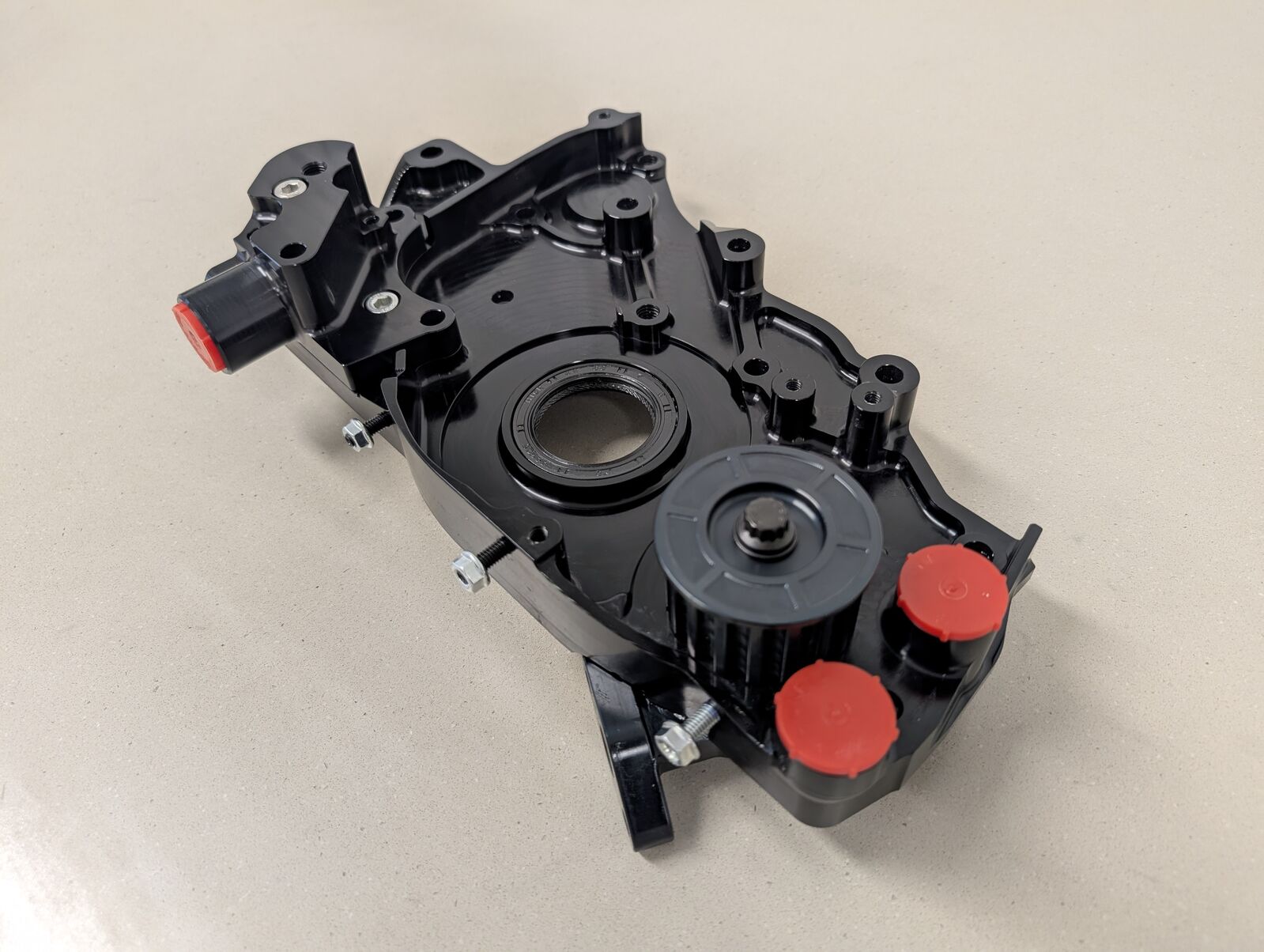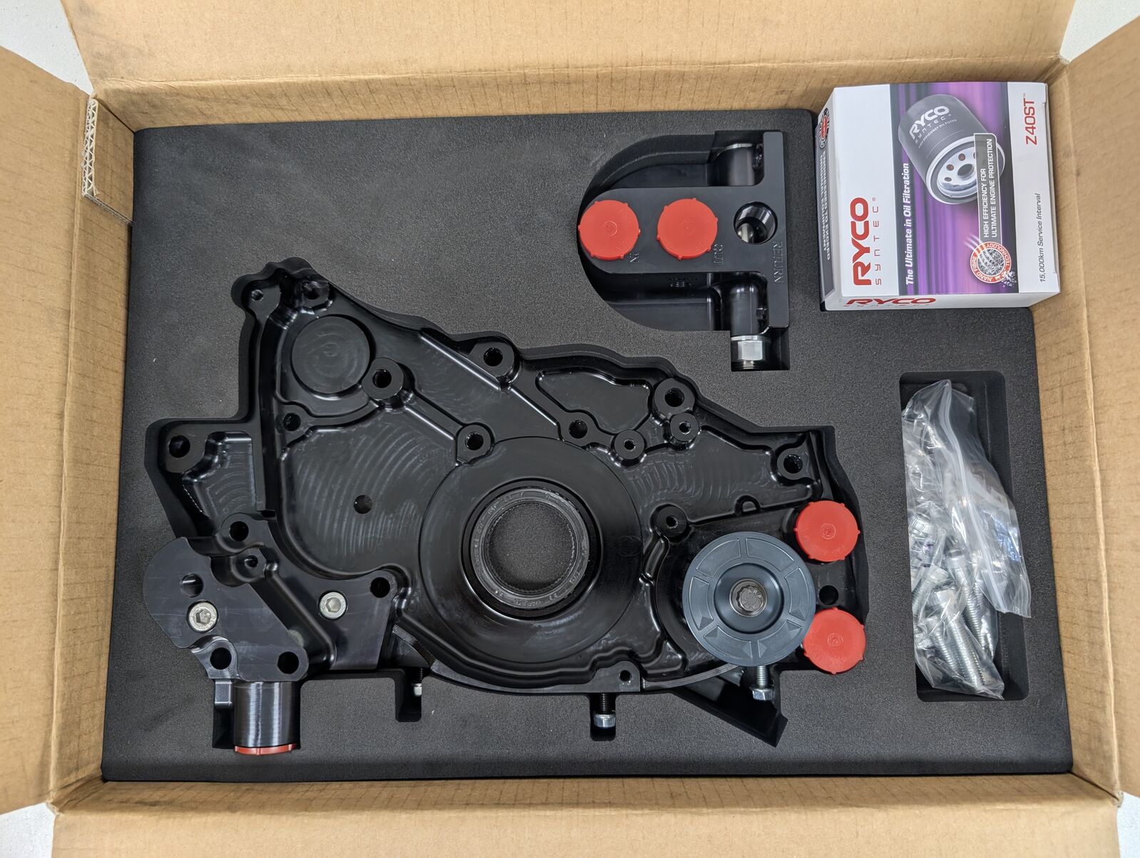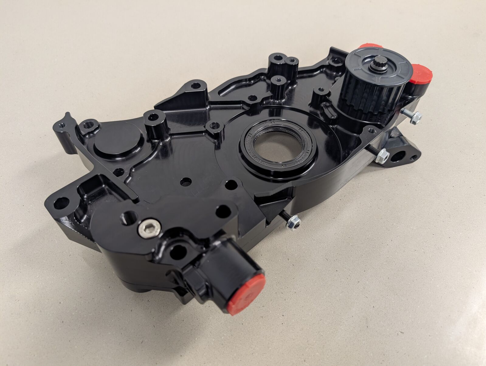These High speed engineering Billet 4G63 oil  pumps feature a gerotor oil pump, precision Japanese bearings, dedicated sensor ports, and includes a remote oil filter housing with an adjustable pressure regulator.