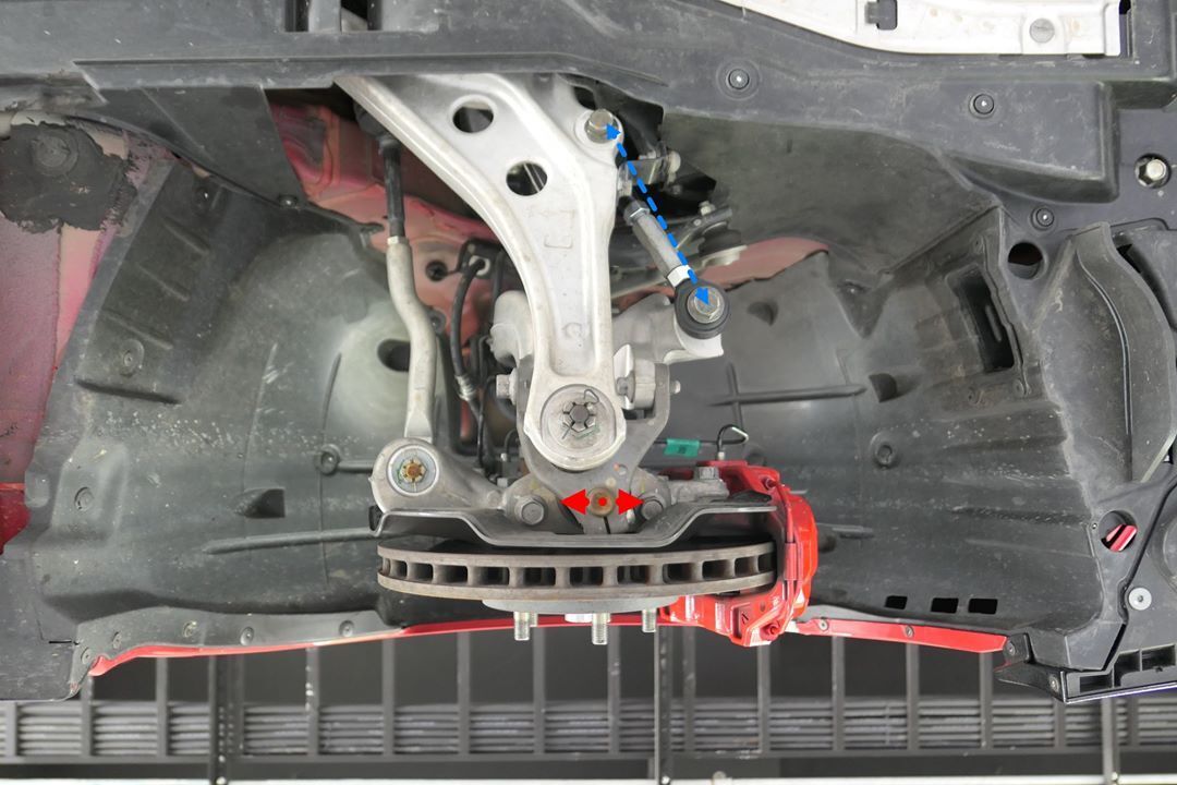 The stopper links on Civic Type-R connect lower control arms and damper forks. By altering damper fork angles, Hardrace adjustable stopper links help you dial Caster settings for greater stright-line stability and steering response.