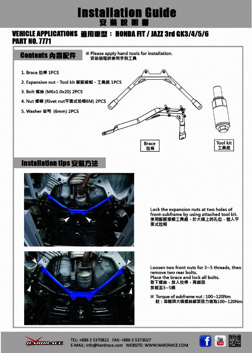 HARDRACE is proud to announce the new front middle brace for HONDA FIT GK. The brace is designed to improve handling and chassis rigidity. . Reduce the flex of the vehicle chassis . Improving the stiffness . Made of superior quality steel, provides more strength