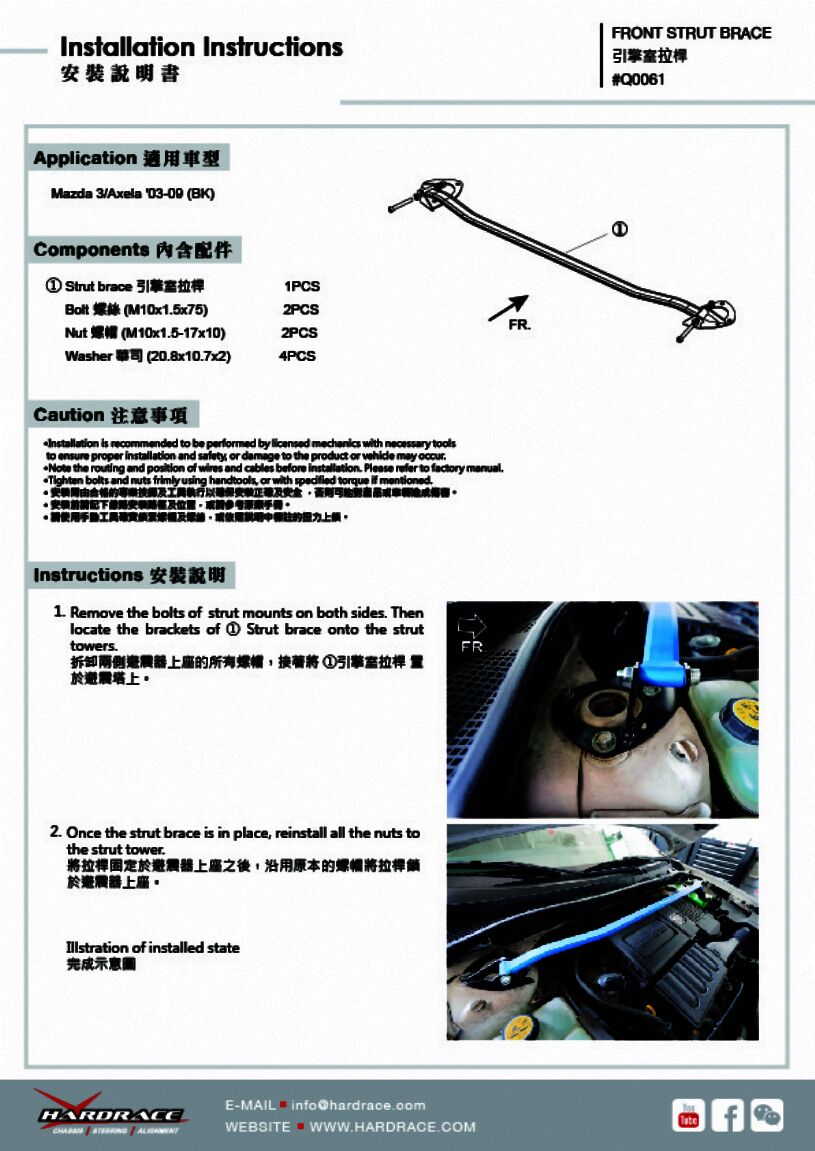 FRONT STRUT BAR 1PCS/SET MAZDA, 3/AXELA, BK 03-08, BL 09-13