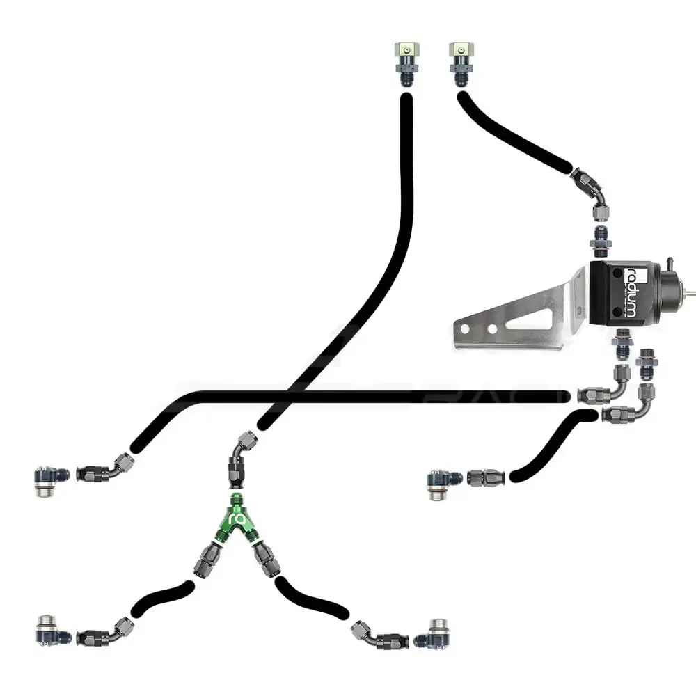 Includes low-profile swivel banjo fittings for the fuel rails with a 45-degree hose ends
