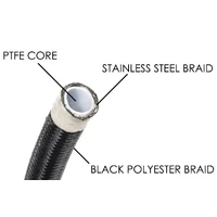 All Radium Engineering PTFE hoses have been successfully tested in-house to 1200psi although PTFE can typically withstand 2500psi+. They are also for extreme temperatures (-94F to +480F). They feature an extruded PTFE (fluoropolymer) core wrapped in a stainless steel wire braided sleeve. The outer coating is determined by the assembly process: Universal DIY ends (braided PET) or preassembled crimped ends (smooth PVC). All hose ends are type-II black anodized aluminum.