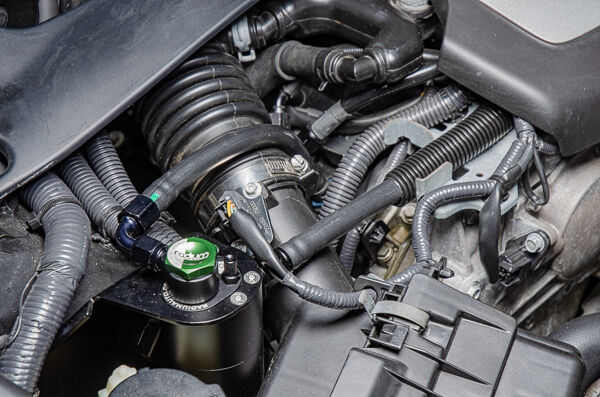 When the intake manifold pressure is close to or greater than atmospheric pressure, the PCV "check" valves close and, thus, these hoses experience no flow. Conversely, the PCV hoses will experience "metered" vacuum when the engine is idling, steady state cruising, and decelerating. This would normally draw unwanted crankcase vapor, unspent fuel, and oil sludge into the intake manifold immediately after a high load run. NOTE: No inline check valve is required since Radium catch cans are pressure sealed. This means a direct intake manifold connection is permitted.