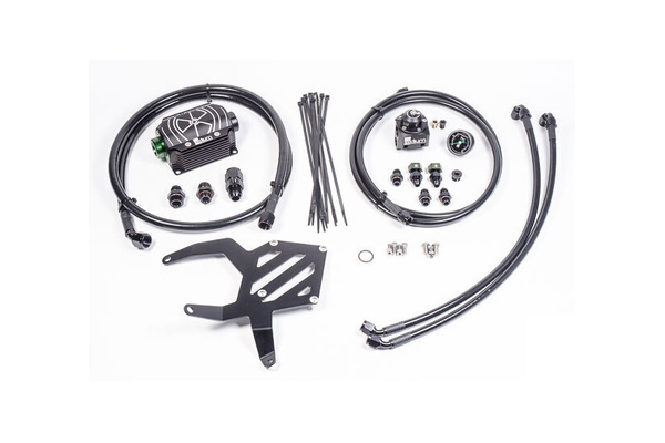 The fuel filter is secured to an inline Radium fuel presssure gauge which is attached to an adjustable Radium fuel pressure regulator. The FPR can be used to mimic the OEM fuel system or it can be ran 1:1 with a vacuum reference. -6AN PTFE hoses are included to connect to the fuel rail and high pressure fuel pump.