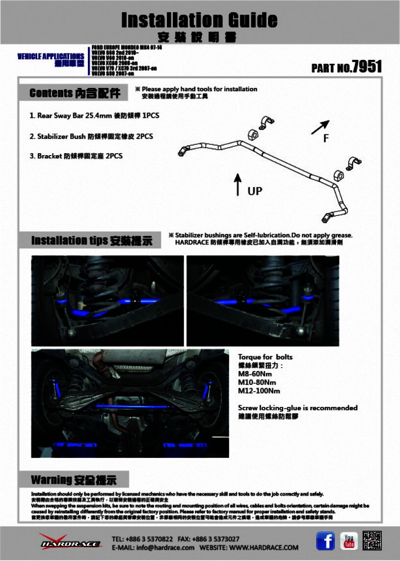 Sway Bar affects the handling and the carƒ??s over steer and under steer. It ties the lower suspension links together across the front or back, will keep your car flat in turns instead of leaning over to one sideHARDRACE sway bars provide better control especially at high speeds cornering