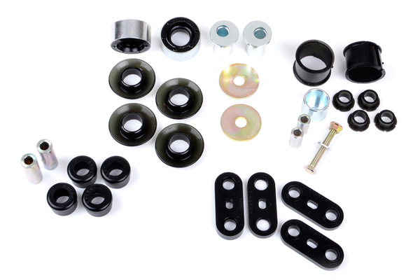 Kit Contents: 2 Shell Bushings, 18 Bushings, 6 Tubes, Removal Tool, 1 Bolt, 3 Washers, 1 Nut, Install Guide, Grease